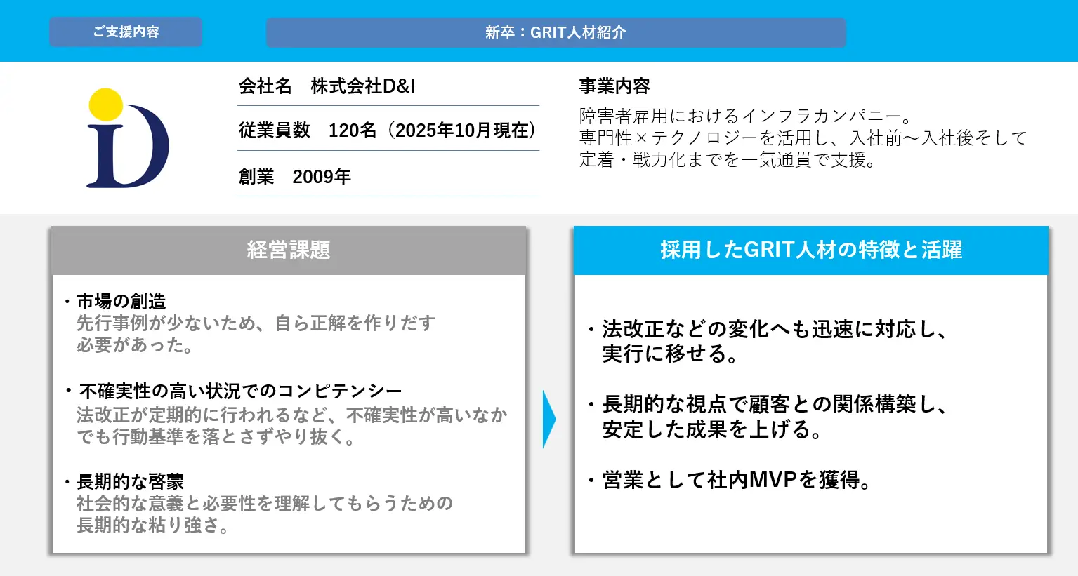 今回の取材を通じて、GRIT人材は企業の持続的成長を支える経営戦略そのものであることを、あらためて強く感じました。特にD&I様の事例は、「市場なき世界」に挑むときに、どのような人材が必要で、どのように組織文化を醸成するかという根本的な問いに対して、明確な示唆を与えてくれます。