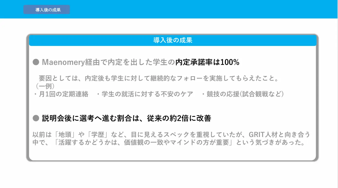 もちろん、紹介数が増えることは歓迎ですが、それ以上に大切なのは、Maenomeryが持つ「学生のGRIT力を育成し、並走する」という独自性を、これからも守り続けてほしいということです。