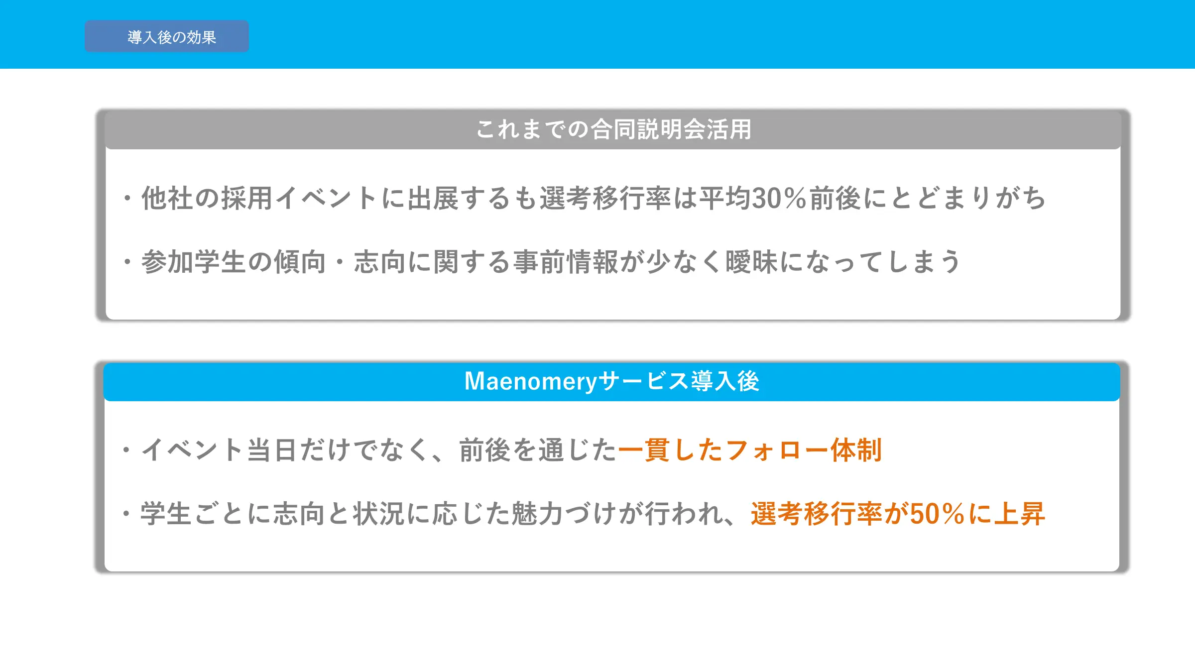GRIT就活イベントでの出展を中心に活用しています。他社との大きな違いは採用イベントから選考に進む学生の割合が非常に高いことです。他社では平均30%程度ですが、Maenomeryさんのイベントでは50%近くまで増加します。非常に大きな成果だと感じており、大変驚いております。