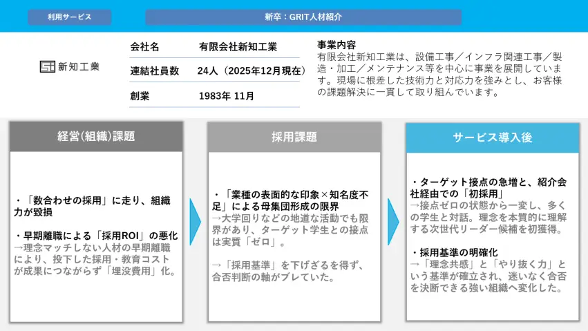 発電所、石油、化学プラントや水処理施設などのインフラを守り続ける有限会社新知工業。協力会社約30社と連携して大規模工事を完遂する、地域屈指の技術者集団です。しかし、その裏側ではBtoB企業ゆえの深刻な課題に直面していました。