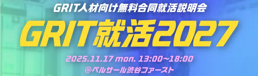 2025年11月17日、新卒採用イベント「GRIT就活2027」が開催されました。本イベントには、株式会社サイバーエージェント様、株式会社みずほ銀行様、JFEエンジニアリング株式会社様、野村證券株式会社、プーマジャパン株式会社をはじめとする、日本を代表する大手・成長企業約50社が出展しました。