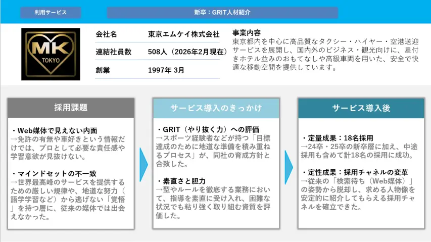 小松氏:人事としては、あえて「終身雇用を求めない」スタンスを明確に打ち出しました。GRIT人材は、自身の将来に対して明確な目標があります。だからこそ、囲い込みをせず、「エムケイをキャリアの通過点にしていい」「夢のために会社を使い倒してほしい」と、包み隠さず伝えています。