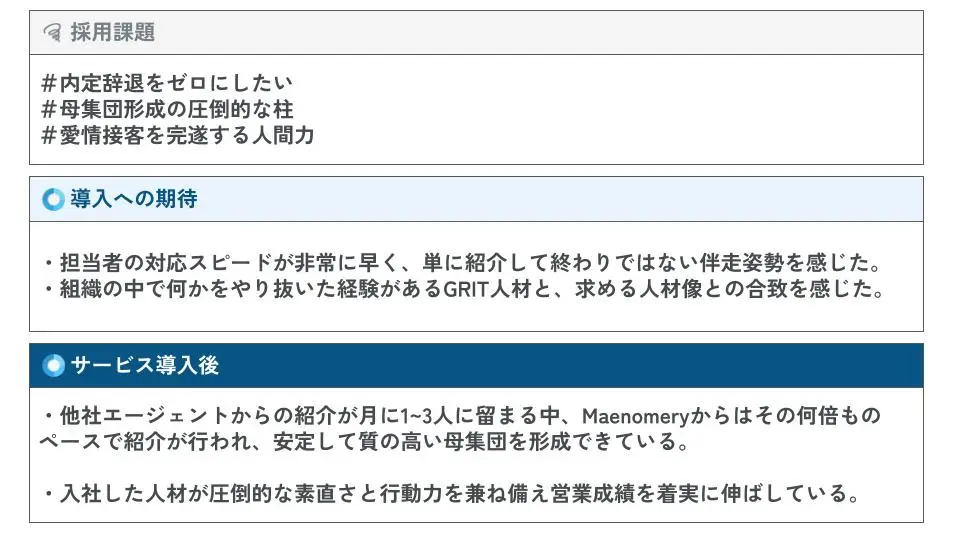 ――自社の努力で選考プロセスを改善した後に、集客の課題が浮き彫りになったのですね。そこでMaenomeryを導入された理由は何だったのでしょうか。